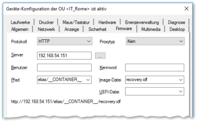 Wenn Sie Geräte mit eLux RP 6 und eLux 7 betreiben, müssen die eLux RP 6-Geräte auf den UC_RP6_X64-Container zugreifen und die eLux 7-Geräte auf den UC_ELUX7-Container. Um alle Geräte mit der jeweils richtigen Software zu versorgen, verwenden Sie in der Geräte-Konfiguration Firmware > Pfad aller Geräte den Container-Parameter __CONTAINER__. Der Container-Parameter wird von den Geräten entsprechend ihrer installierten eLux-Version entweder nach UC_RP6_X64 oder nach UC_ELUX7 aufgelöst. Damit kann für beide Plattformen ein gleichnamiges Image verwendet werden, welches zuvor über ELIAS für für eLux RP 6 und eLux 7 definiert wurde.