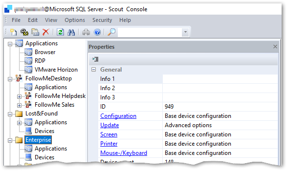 The main window of the Scout Console shows a tree view in the upper left corner that reproduces the organizational structure with all managed devices. When you log in for the first time, you will see the organizational units Lost&Found and Enterprise which are created by default. The latter serves as the top node of your organizational structure.